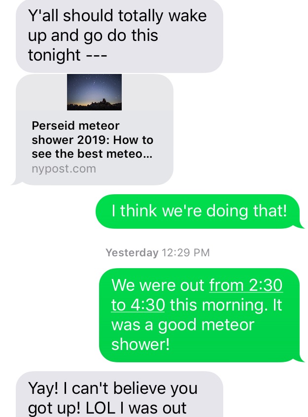 “You should totally wake up and go watch the Perseid Meteor Shower tonight!” my mother-in-law and avid science teacher texted.